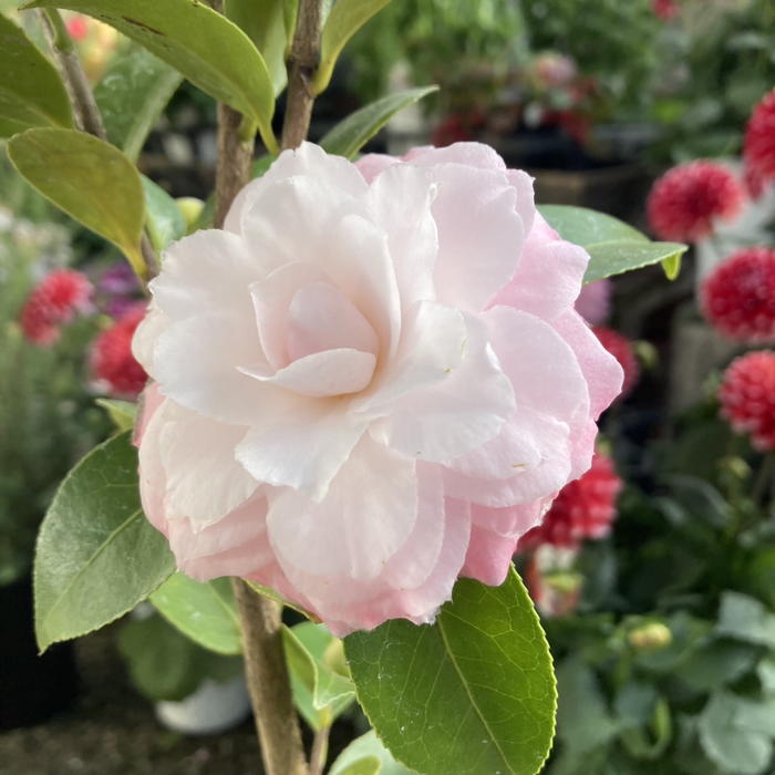 淡いピンクと白が混ざる大輪八重咲き。冬の庭を華やかに彩る美椿。