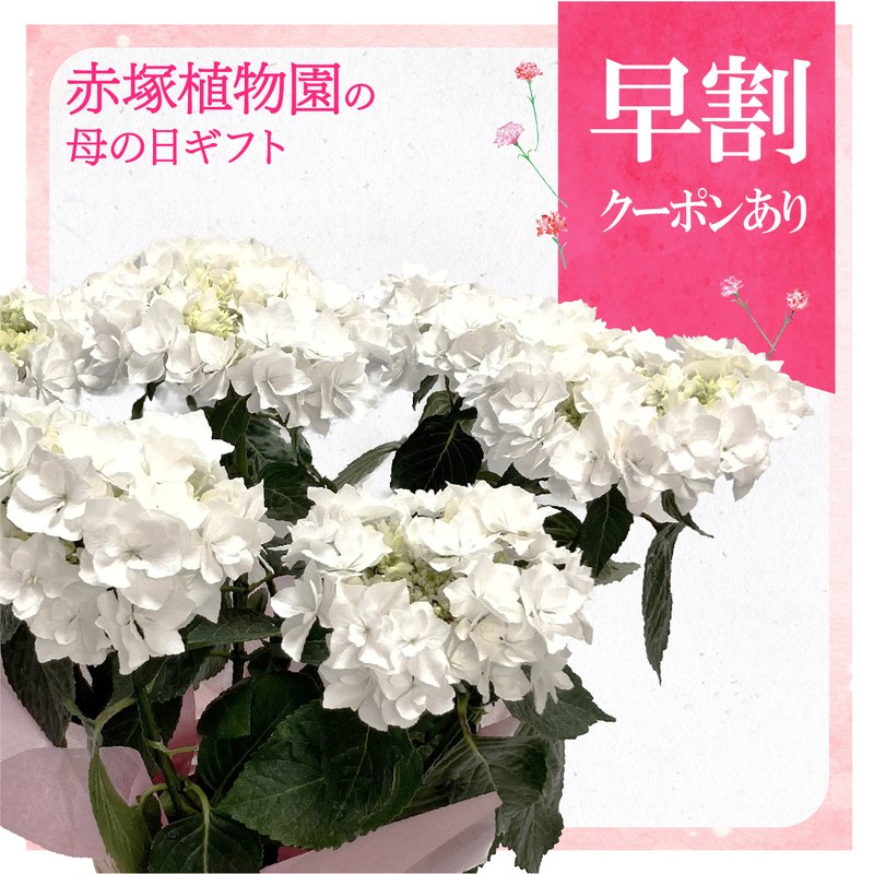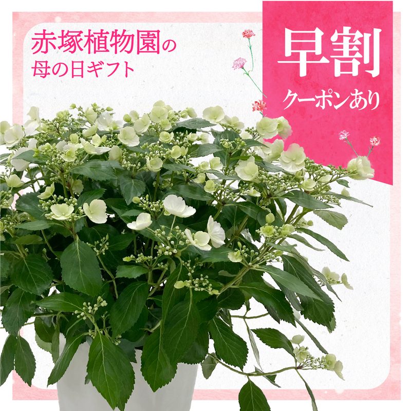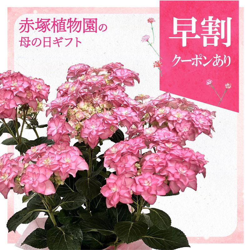 赤塚植物園オンラインの「母の日」フラワーギフトは、カーネーションはもちろん、育てやすくて長く楽しめるアジサイ、普段出回りにくい魅力的な人気品種を厳選してご紹介。