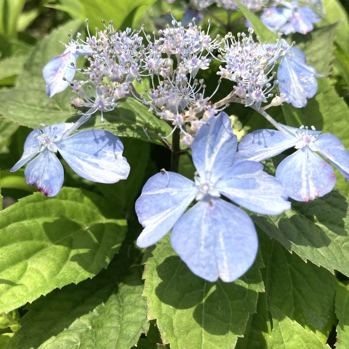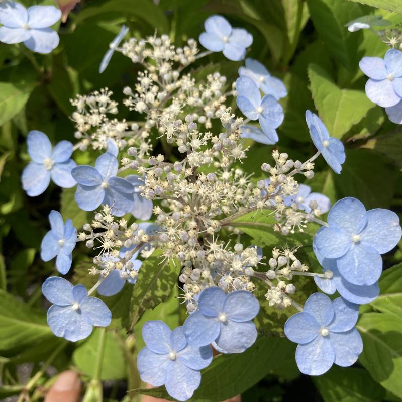 華麗で豪華なガクアジサイよりも、しとやかで華奢なイメージ、とても優しい趣を感じます。主に白や青系の花が多いですが、紅色に染まるものもあります。 また、開花期間中に色の変化があるものもあり、清楚でありながら表情豊かに私たちの目を楽しませてくれます。 ちなみに手まり状のこんもりしたアジサイは「ガクアジサイ」の変種として位置づけられています。