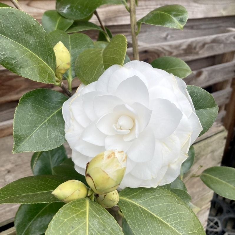 [ツバキ|スワンレーク]アメリカで作られた品種で、透明な白色が美しい千重咲き大輪です。