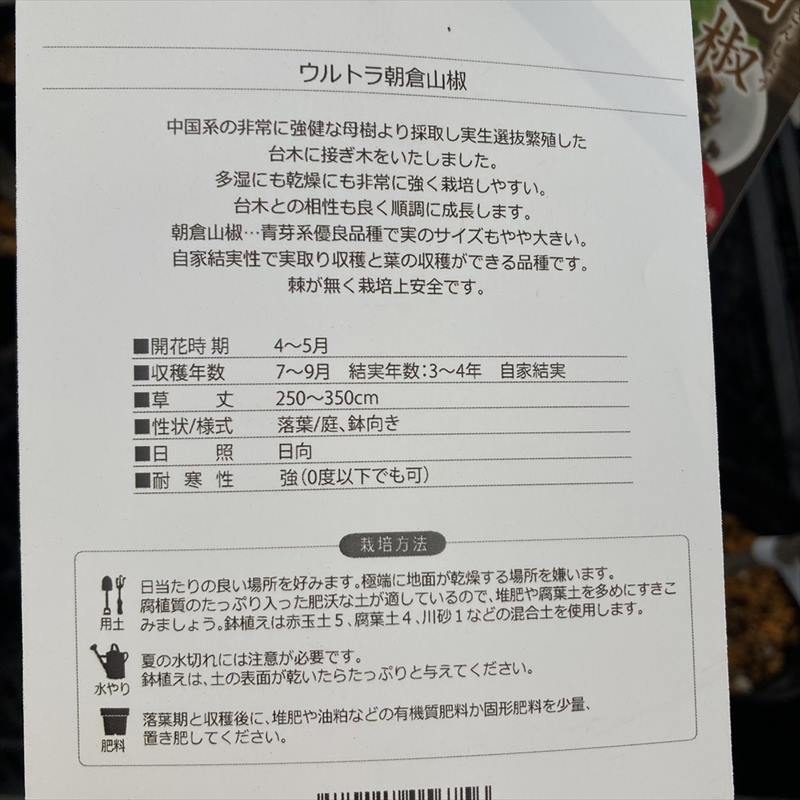 朝倉山椒は、青芽系優良品種で実のサイズもやや大きいです。自家結実性で実取り収穫と葉の収穫ができる品種です。棘が無く栽培上安全なのもうれしいです。