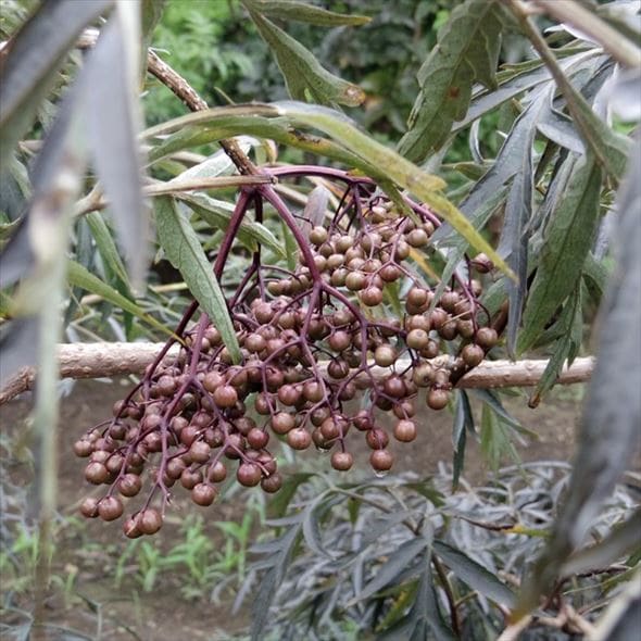 秋につく黒色の実(エルダーベリー)にも花と同じ薬効があり、シロップやジャムに調理されます。