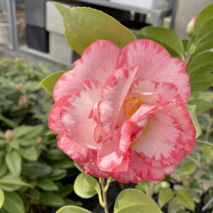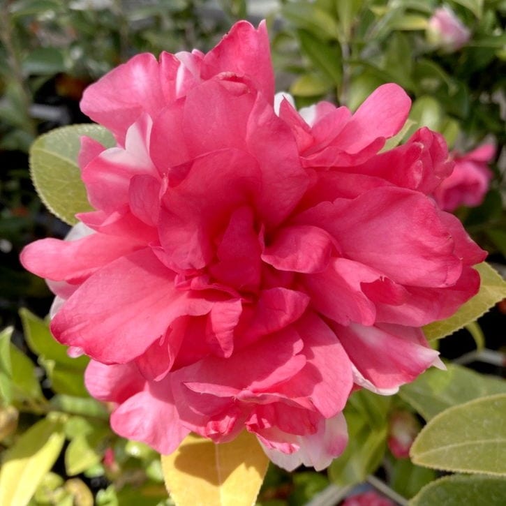 白にピンク覆輪が入る華やかな大輪八重咲き。優雅で気品ある洋種ツバキ。