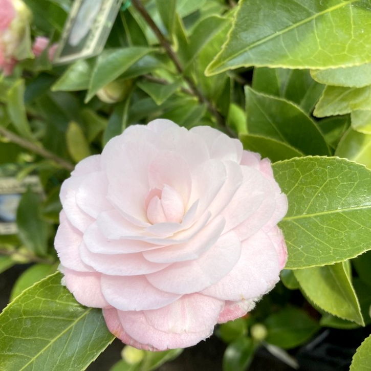 純白に近い淡ピンクの上品な花。気品漂う美しい中輪ツバキ。