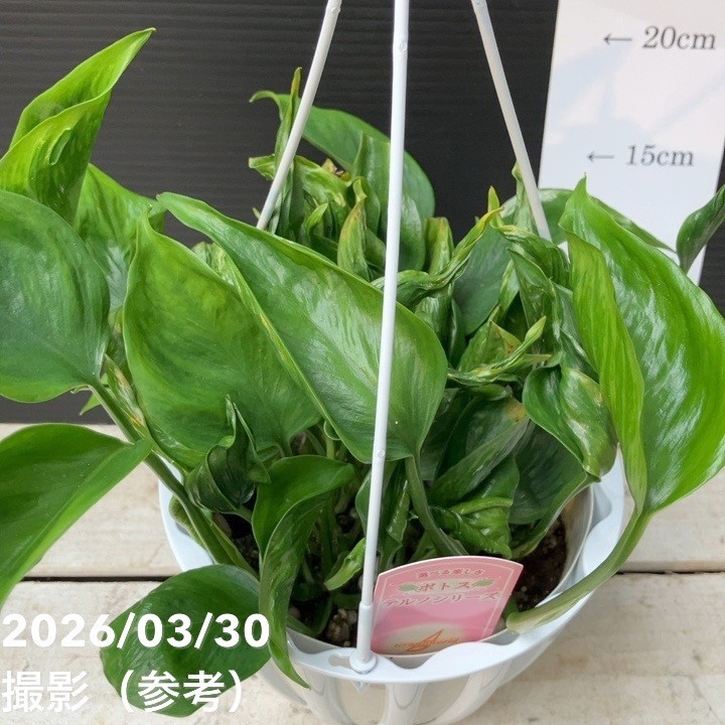 巻き葉・羅紗葉・マーブル模様が融合した、唯一無二の個性派ポトス。吊り鉢でインテリア性も抜群。