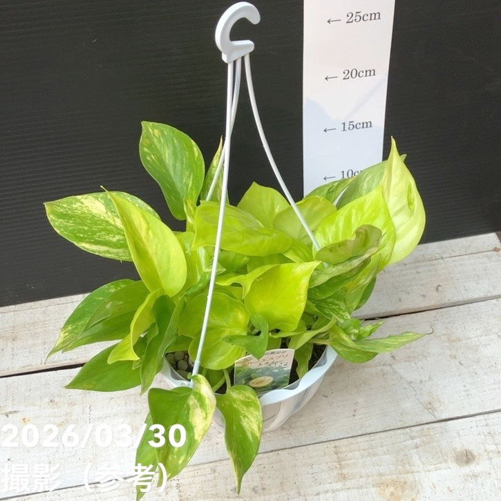 立体的な葉と明るい斑が魅力。華やかな吊り鉢のポトス。