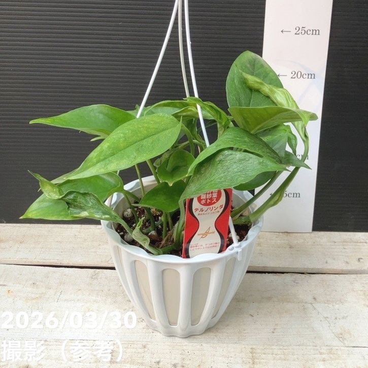 白斑マーブルが美しい華やかなポトス。吊り鉢で楽しむ観葉植物。