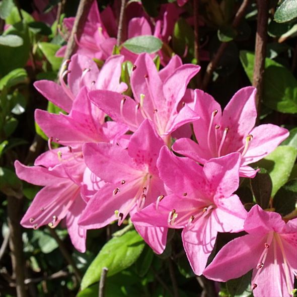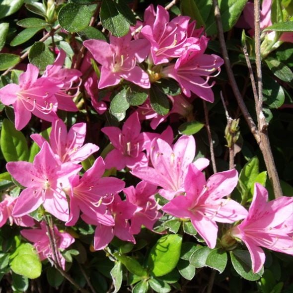 久留米ツツジは、小さな花を枝先に多くつけ、一斉に咲くので、花の時期は全体が花色に染まります。
