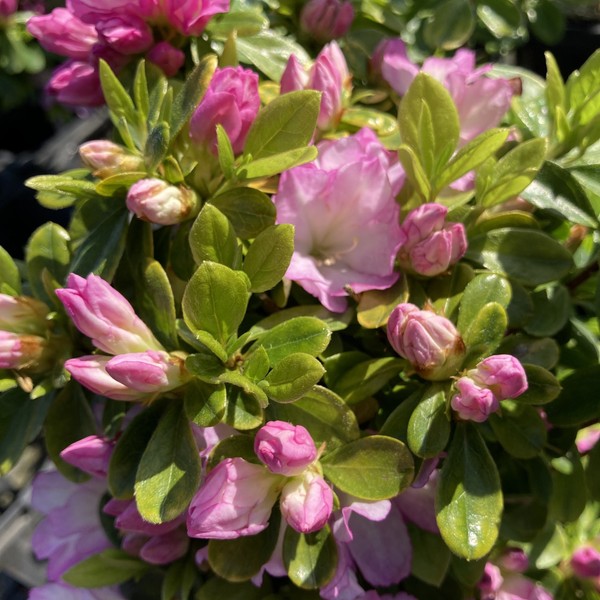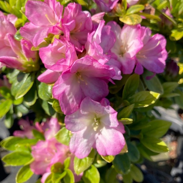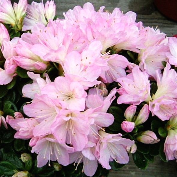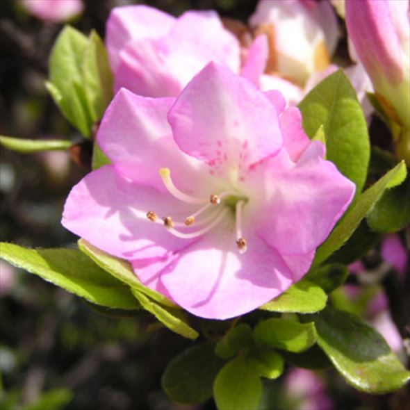 淡いピンクの小さな花が重なり合って咲く二重で中輪咲きのツツジです。