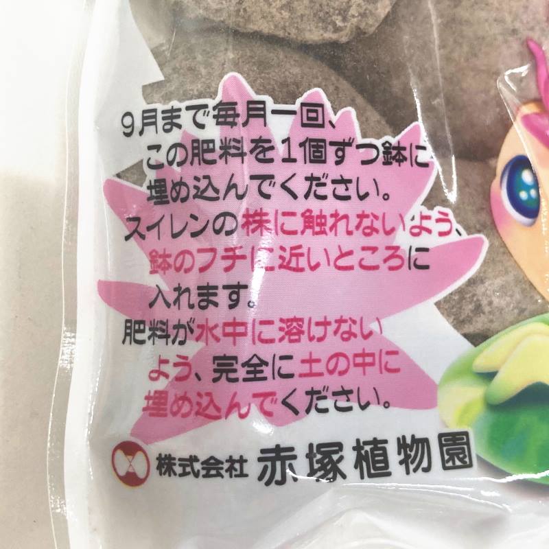 生産の過程において種々の肥料を活用し、その中で最も扱いやすく効果のあるものを選別し小袋に封入いたしました。熱帯スイレンの開花が加速し始める7月ごろをスタートに9月ごろまでの気温のある間、一ヶ月に1粒を内鉢の隅に押し込んでおくだけで熱帯スイレンの成長はもちろん花数を向上させます。