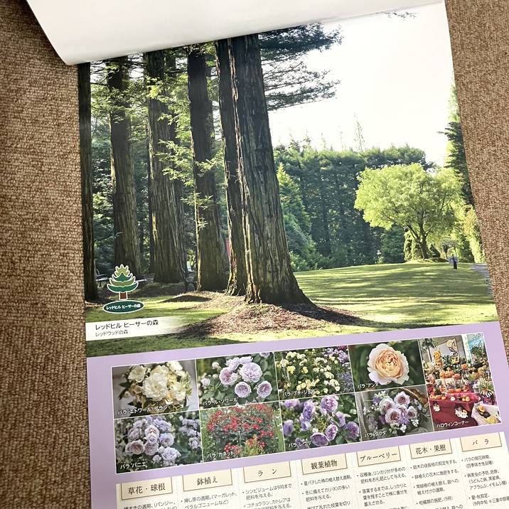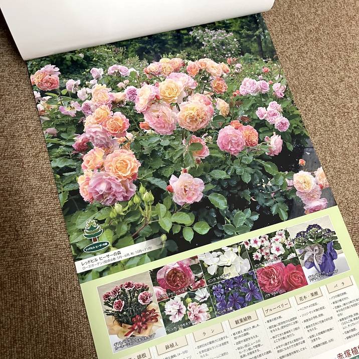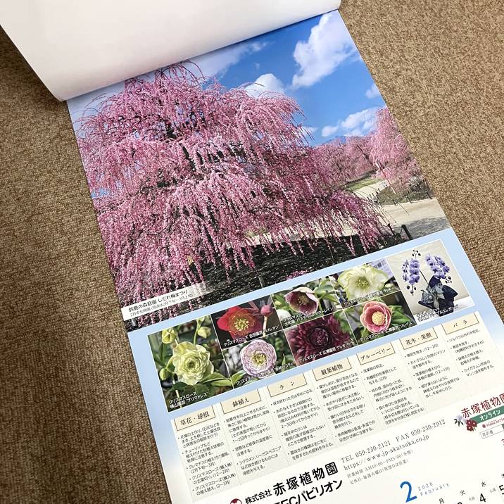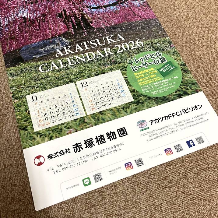上部には、赤塚植物園が運営する観光公園の「鈴鹿の森庭園」「赤塚シャクナゲガーデン」「レッドヒルヒーサーの森」の季節折々の美しい風景写真がプリントされています。