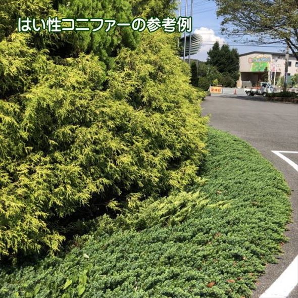 写真でも掲載していますように、まっすぐ上に伸びるのではなく、地面を這(は)うように広がるコニファーです。