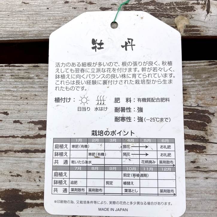 肥料:牡丹は肥料をとても好む植物です。9月~10月の新しい芽が出る前、2月~3月の春肥、5月~6月の花後のお礼肥え、の年3回与えましょう。肥料が根にあたらないように注意してください。