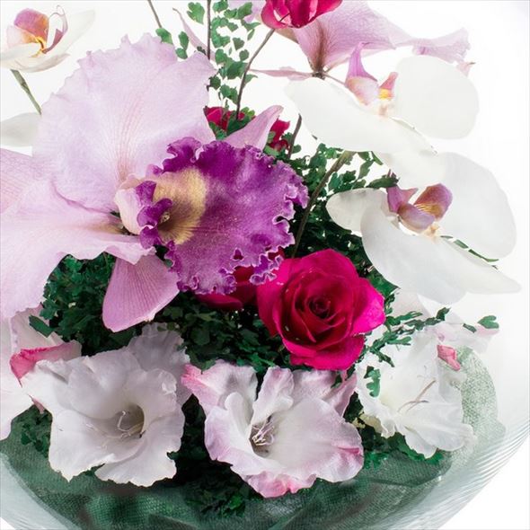 花材:カトレア・胡蝶蘭・バラ・グラジオラス