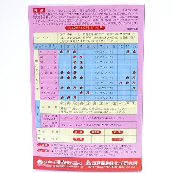 花よし,葉よし,姿よし,日本古来の美しさを持つツバキに、洋種ツバキのはなやかさを加えたツバキ、サザンカ類をより美しく咲かせるため、年間を通じてツバキが養分を必要とするときいつでも施せる肥料配合をもつツバキに理想的な専用肥料です。