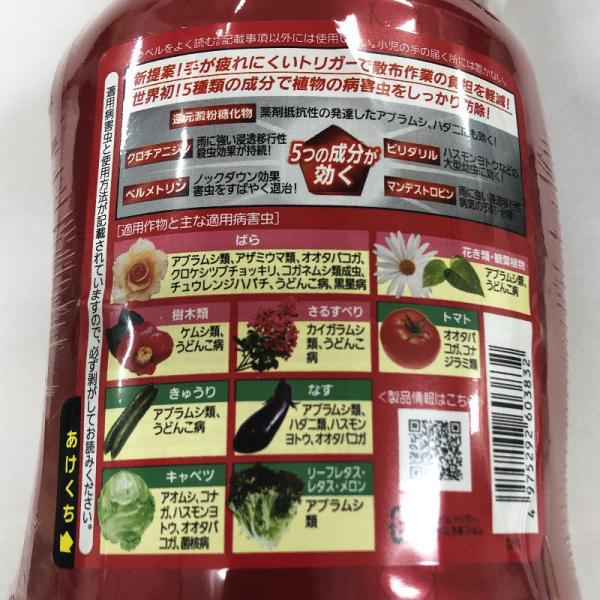 殺虫効果では、ペルメトリンという成分が速効的に害虫を退治します。また、ピリダリルという成分は、ヨトウムシなどの大型の害虫への防除効果があります。同時にクロチアニジンとマンデストロピンは、浸透移行性で雨が降った後でも効果を示し、前者は害虫に後者は病気に効果を発揮します。