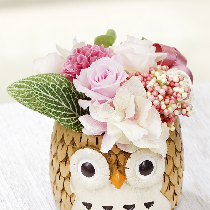 福が来る、苦労しないなど縁起の良い可愛い「ふくろう」に、やわらかなピンク系のお花をアレンジしました!