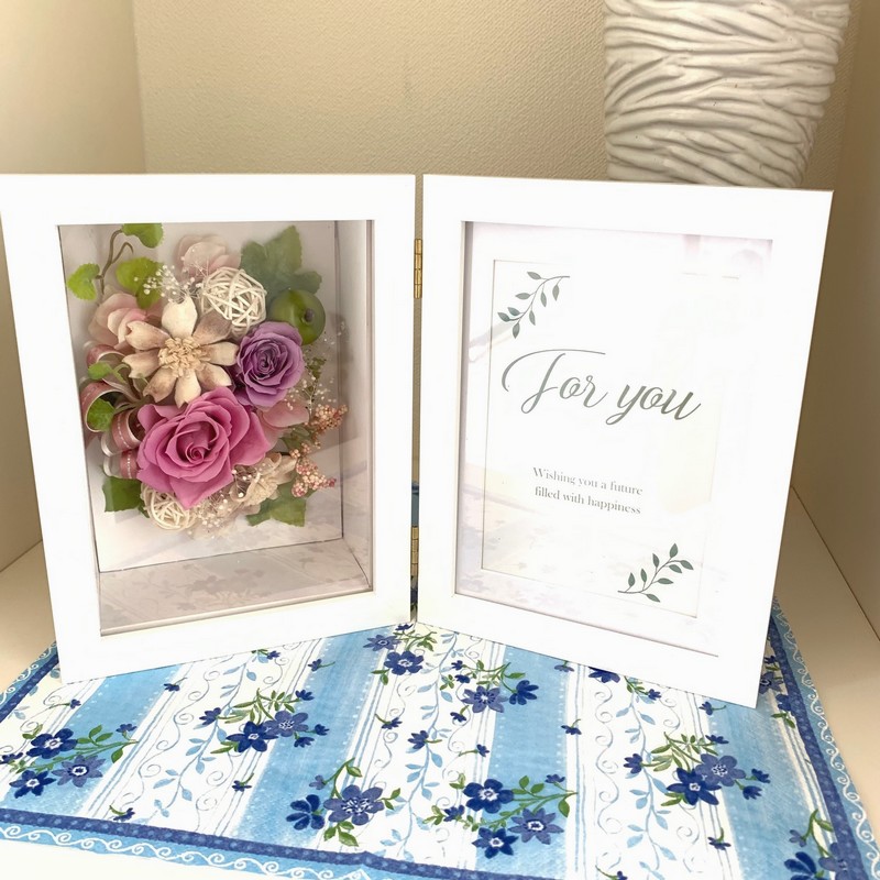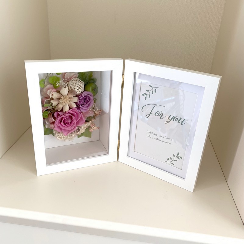可憐なアレンジのプリザーブドフラワーが、思い出の写真に華を添えます。