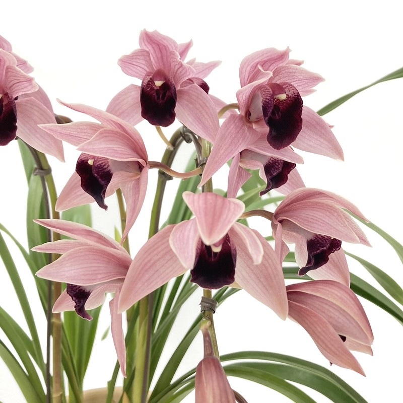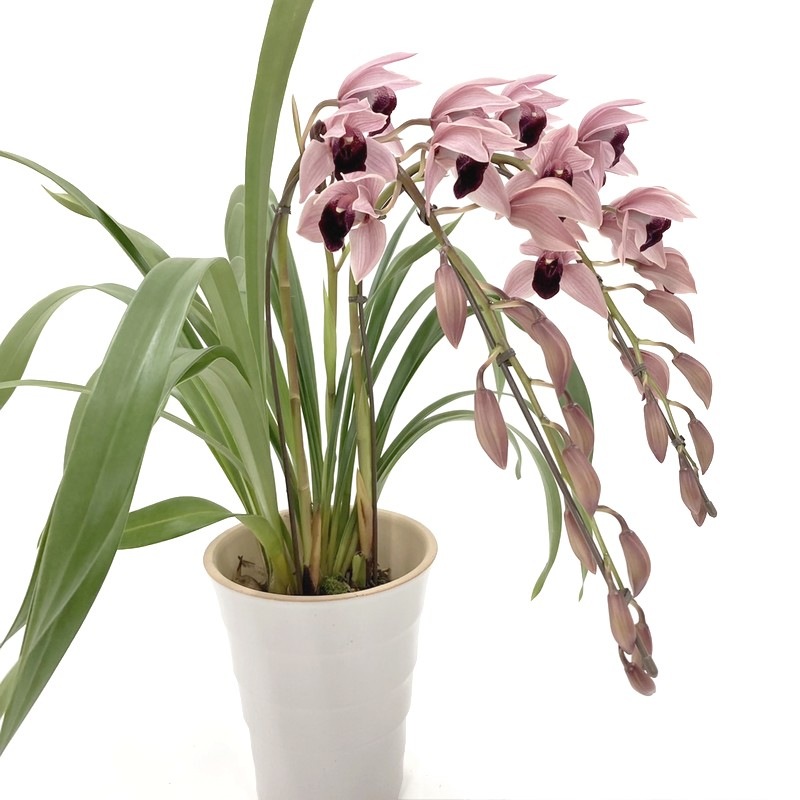 2本立てのピンク色のシンビジュームを、胡蝶蘭のように枝を前方にしならせたアーチ型に仕立てた華やかな冬の鉢植えです。