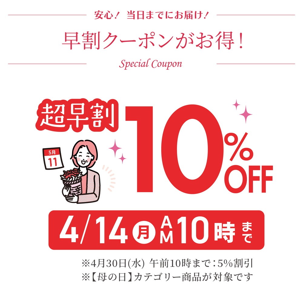 ●5月5日以降のご注文は、一部地域で母の日までにお届けできない場合がございます。(該当地域:北海道、青森県、秋田県、宮崎県、鹿児島県)