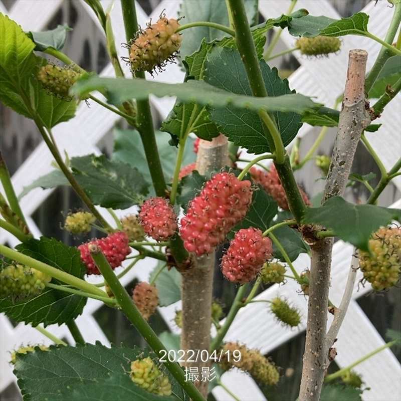 5~6月頃に収穫を迎え、実の色は、緑→赤→黒紫→黒と変化し、触ってぽろんと取れます。