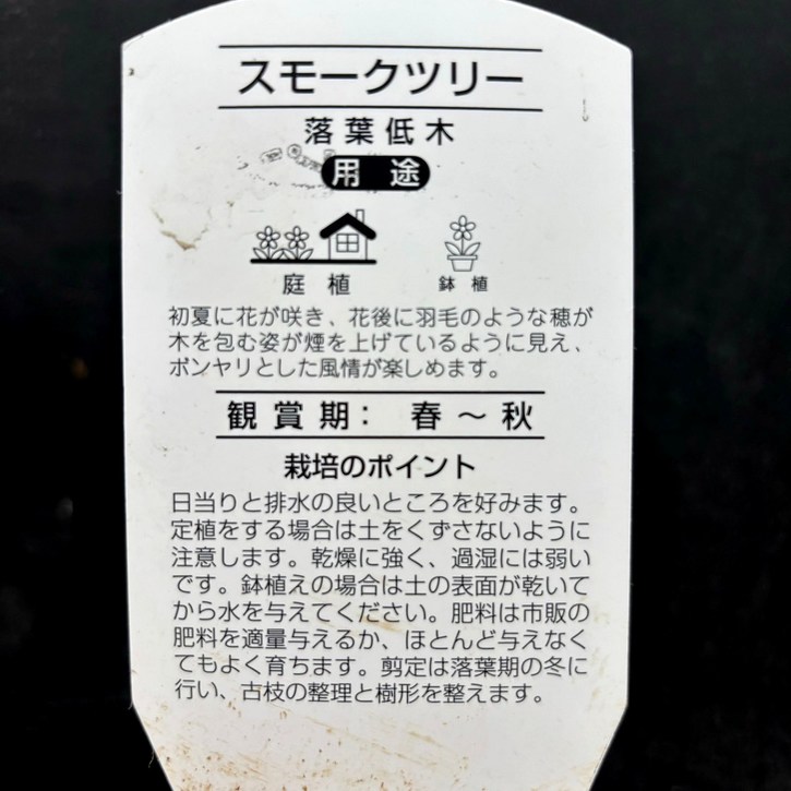 コンパクトな樹形で非常に花付きがよく、鉢植え向きの最適な品種です。花が咲いた後、綿のような毛(花柄)が煙のように見えます。