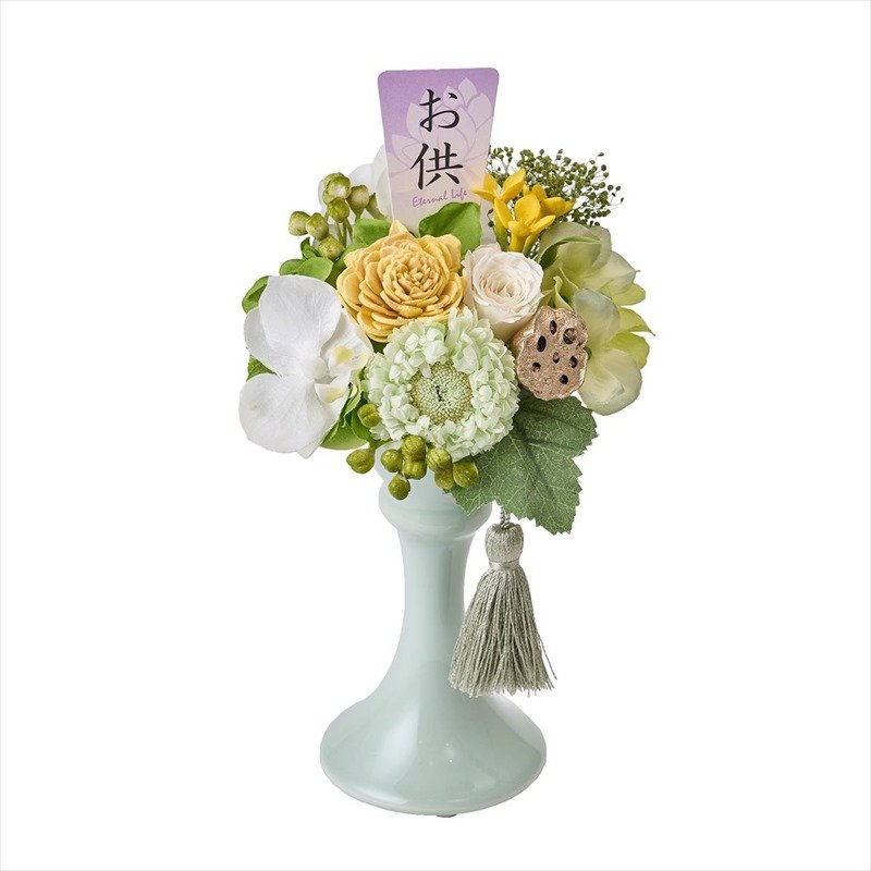 爽やかな黄~グリーン系のプリザーブドフラワー&アーティフィシャルフラワーの仏花アレンジ。