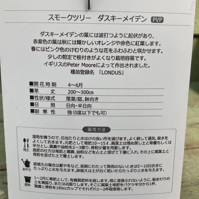 ダスキーメイデンの葉には波打つように起伏があり、赤紫色の葉は秋には輝かしいオレンジや赤色に紅葉します。春にはピンク色のけむりのような花をふわふわと咲かせます。少しの剪定で枝付きがよくなり栽培容易です。イギリスのPeter Mooreによって作出されました。