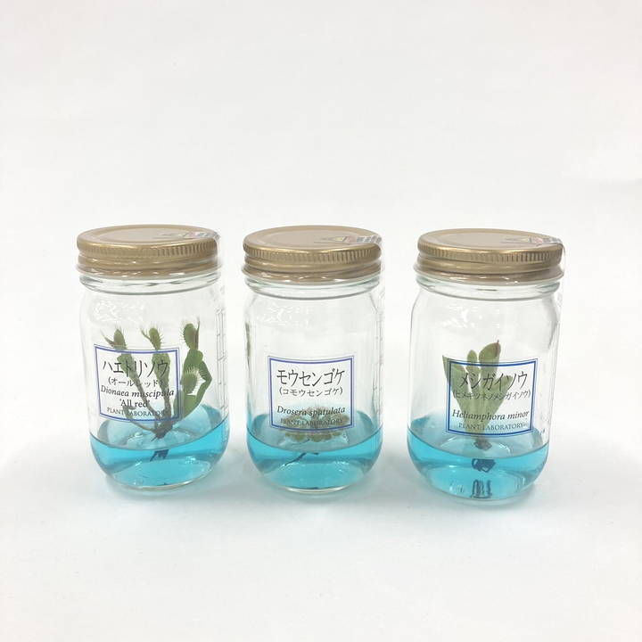 植物でありながら虫を捕獲する特性を持ち、その独創的なフォルムや妖艶な美しさでコアな人気の食虫植物を、コンパクトなガラス瓶で栽培したお洒落なインテリアプランツです。