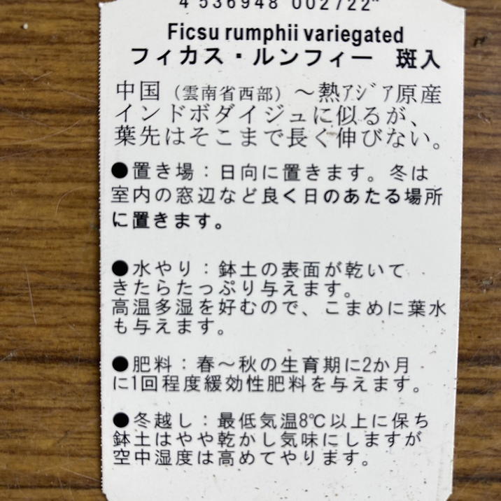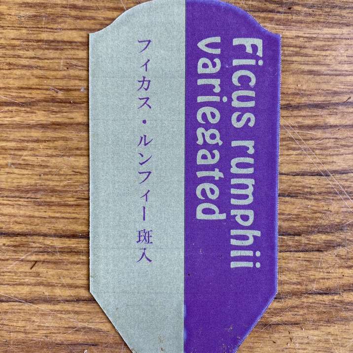 流通量の少ない希少種、ルンフィーの白斑入りです。インドボダイジュに似ていますが、葉先はそこまで長く伸びません。
