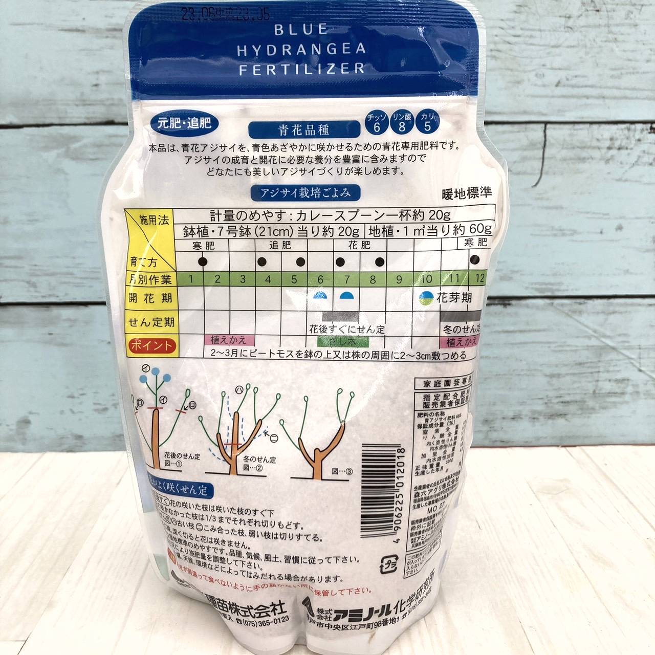 青花専用 アジサイ専用肥料は、酸性成分を強化して配合されていますので、植えつけ時や花後の御礼肥、寒肥、追肥などで継続的に与えることで、青い色を安定して発色させることができます。