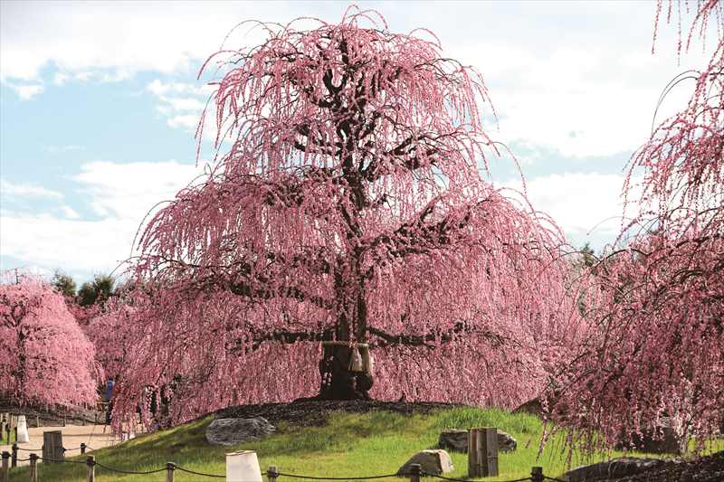 鈴鹿の森庭園園内入口すぐの場所に植栽され、ひときわ目を引く名木「天の龍」は、樹齢100年以上と推定される呉服しだれで、現在品種が確認されている中では日本最古のもののひとつではないかといわれています。