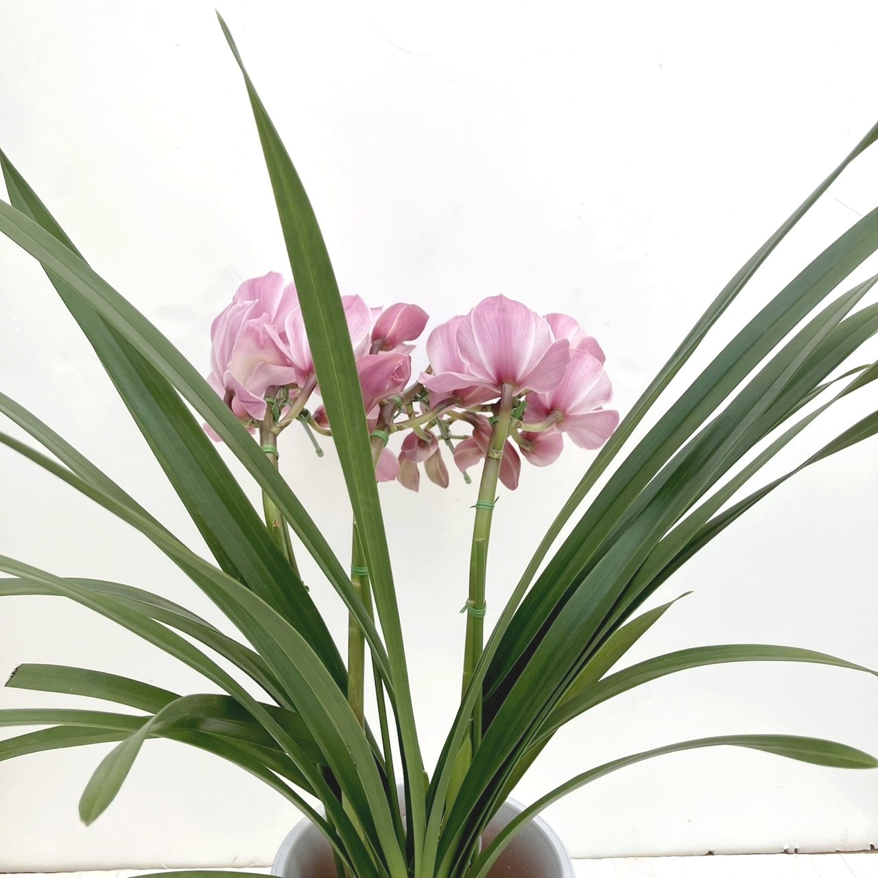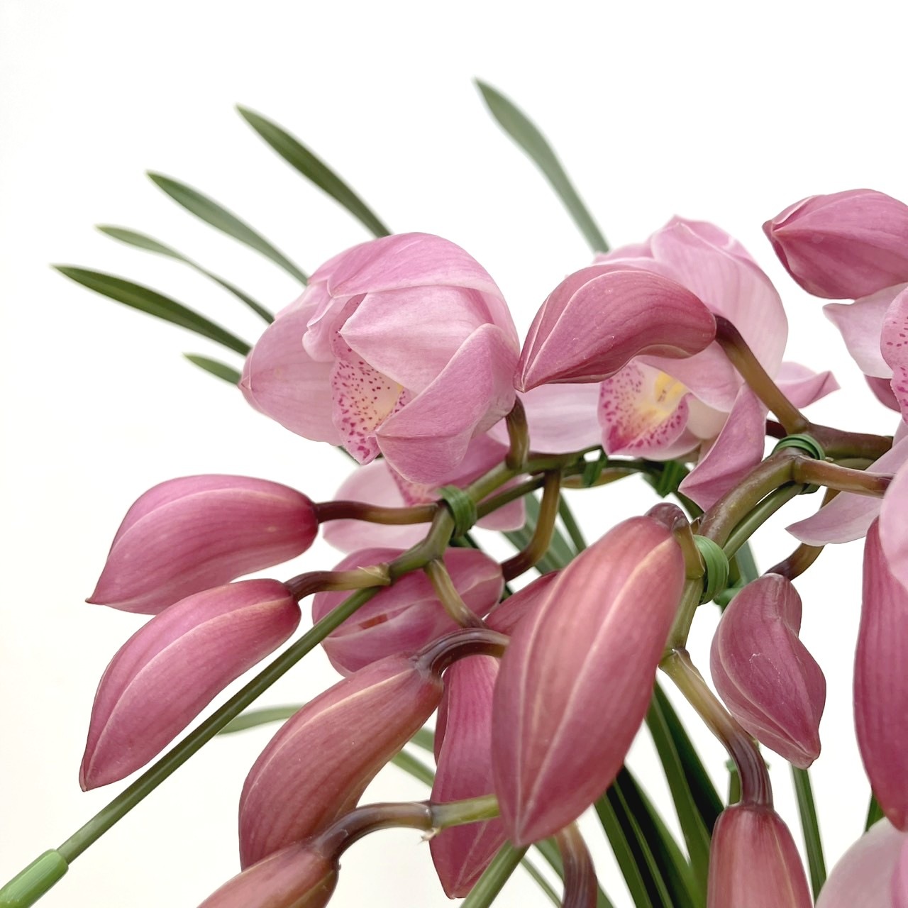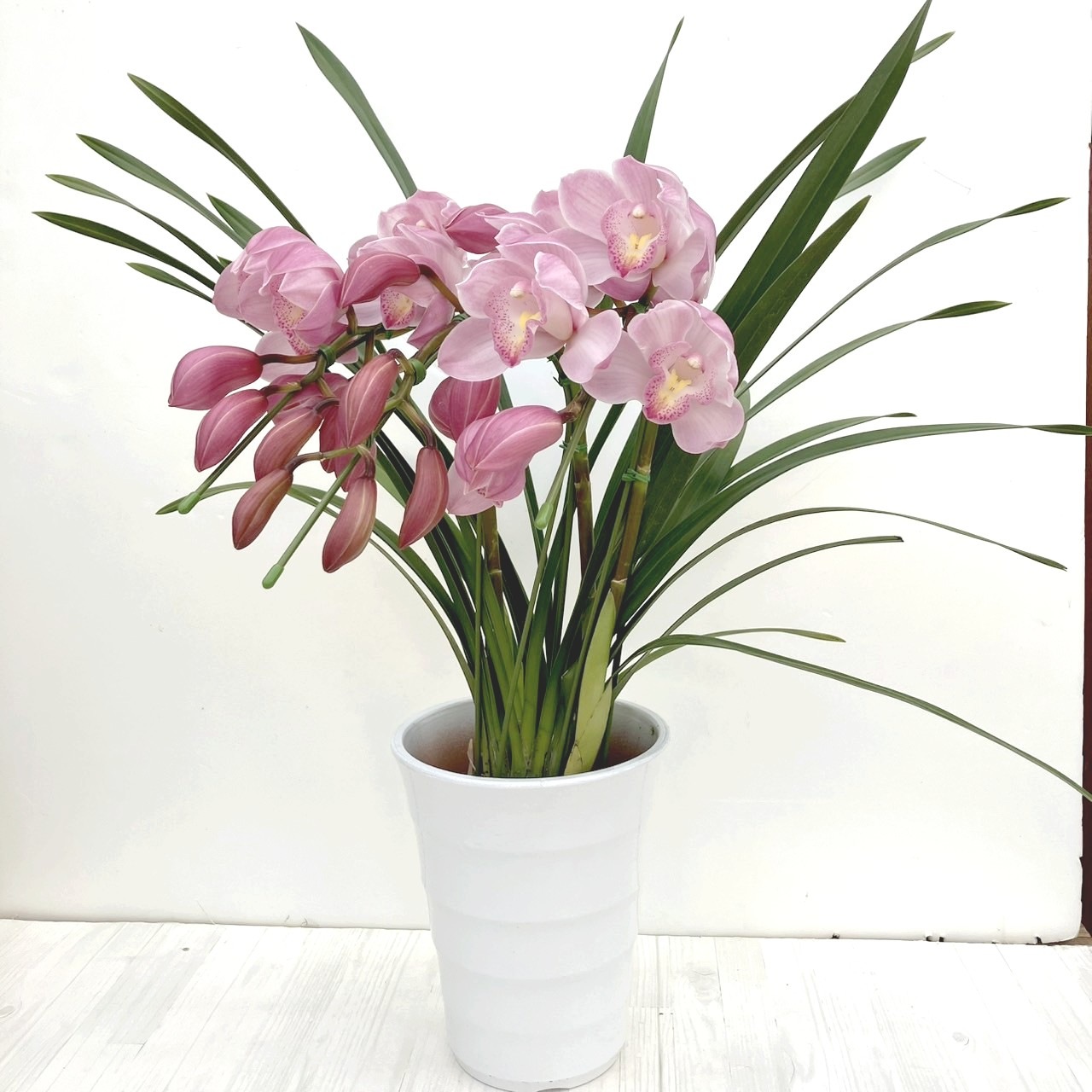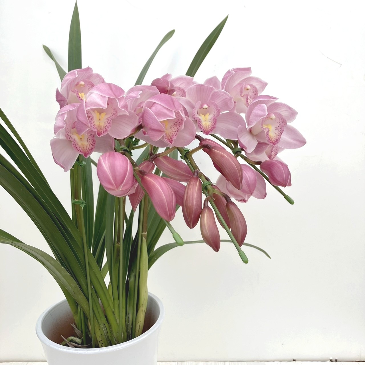 3本立てのピンク色のシンビジュームを、胡蝶蘭のように枝を前方にしならせたアーチ型に仕立てた華やかな冬の鉢植えです。