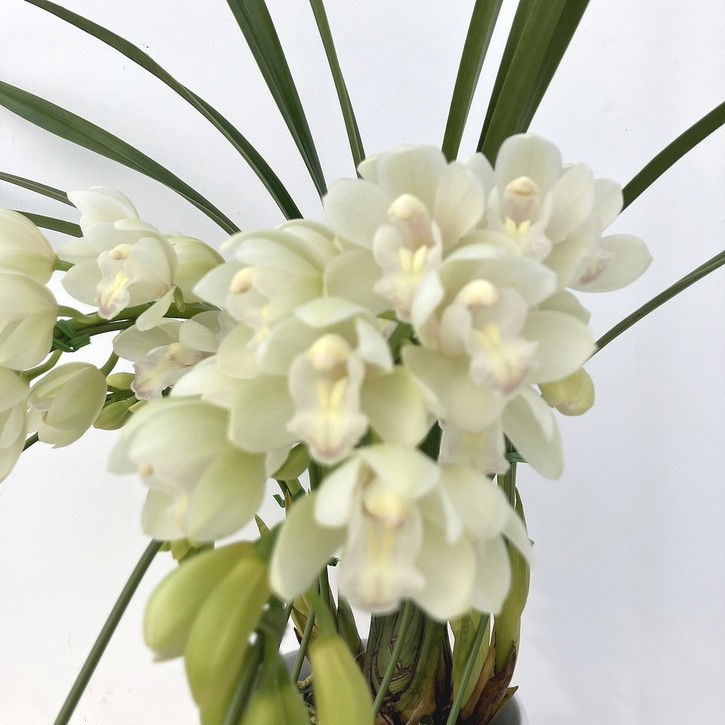 3本立ての白色のシンビジュームを、胡蝶蘭のように枝を前方にしならせたアーチ型に仕立てた上品な冬の鉢植えです。