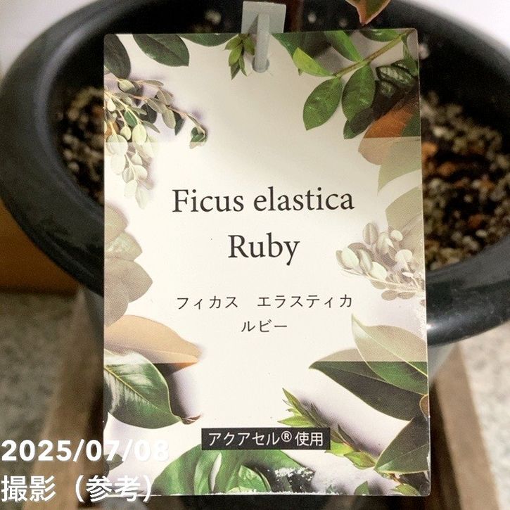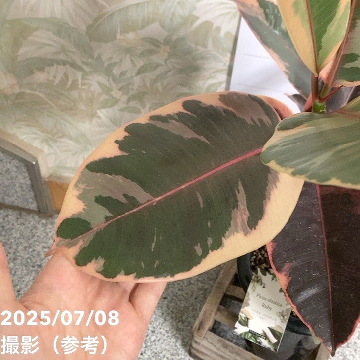 フィカス エラスティカ ルビーは、赤みを帯びた斑入りの葉が美しいゴムの木の品種です。