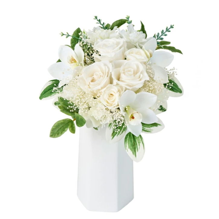 純白にグリーンの清楚なアレンジ。 お悔やみ、お供えには水やり不要で枯れないプリザーブドフラワーがおすすめです。
