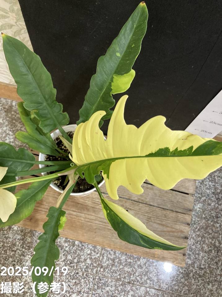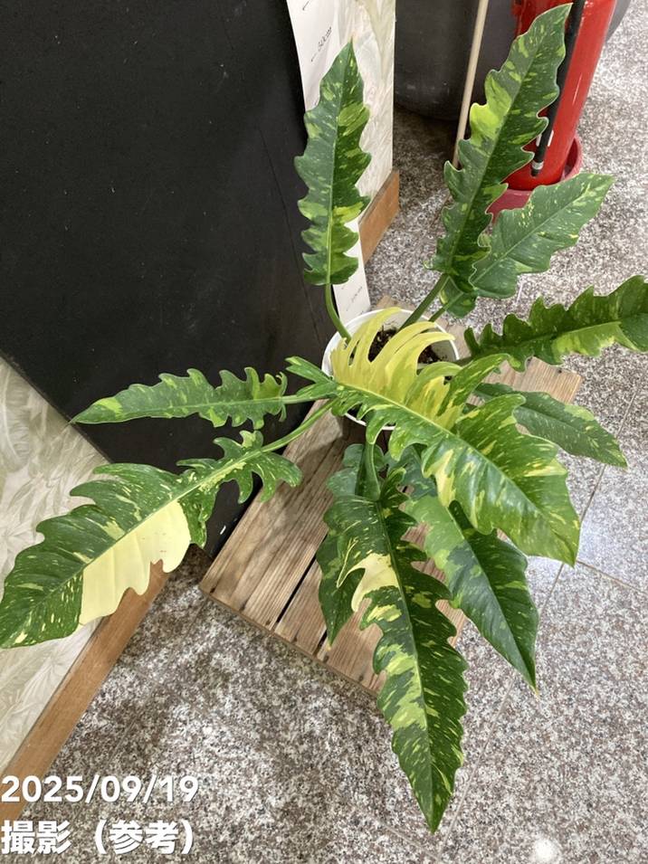 丸みを帯びたギザギザが特徴的で、散りばめられたクリーム色の模様(斑)が美しい品種です。