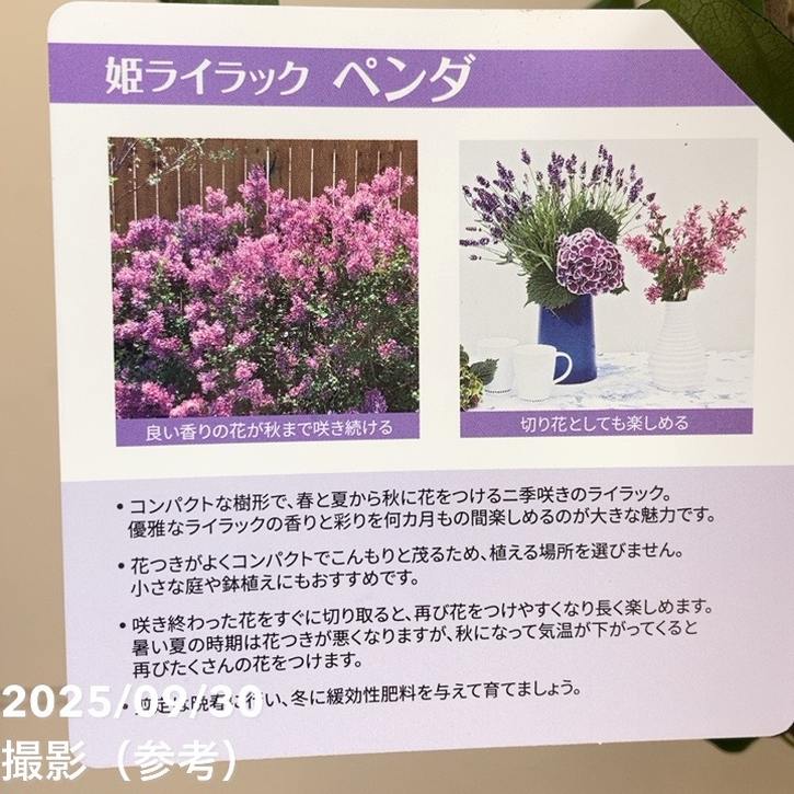 姫ライラックは優雅な香りと彩りをご家庭でも楽しめるようになった、コンパクトなライラックです。br> ペンダは春と夏~秋に花をつける二季咲きのライラックで、春に紫桃色の花が株全体を覆うように咲いた後、再び花をつけ、霜が降りる頃までよい香りの花を咲かせます。br> 暑い夏の時期は花つきが悪くなりますが、秋になって気温が下がってくると再びたくさんの花をつけます。