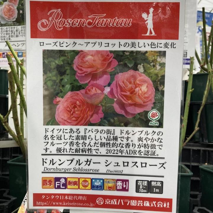 ドイツにある『バラの街』ドルンブルクの名を冠した素晴らしい品種です。 ローズピンク〜アプリコットの美しい色の変化、優れた耐病性、爽やかなフルーツ香を含んだ個性的な香りが特徴です。2022年ADR認証。