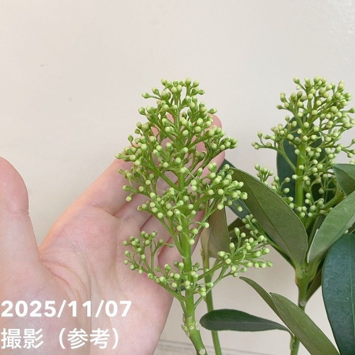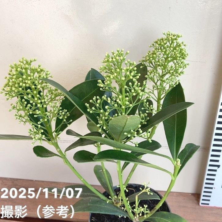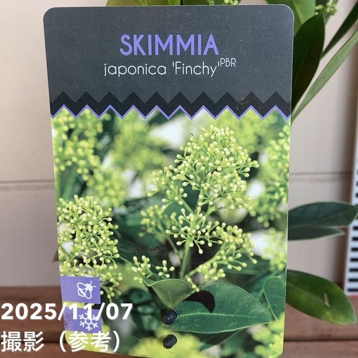 スキミア フィンチー(Skimmia japonica 'Finchy')は、光沢のある濃緑の葉と、春に咲く黄緑色の蕾~白花が美しい常緑低木です。