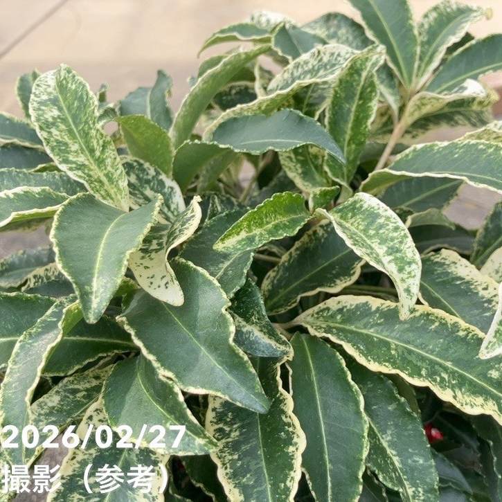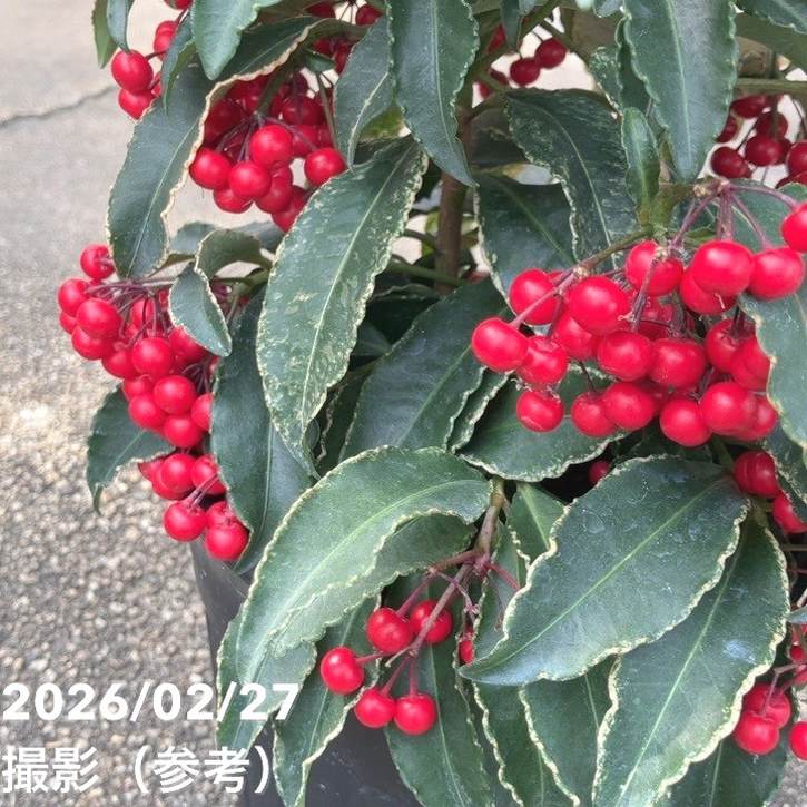 鮮やかな斑入りの葉に、薄くまだらがかった白~クリーム色の模様が入り、通常の万両とはひと味違った華やかさがあります。